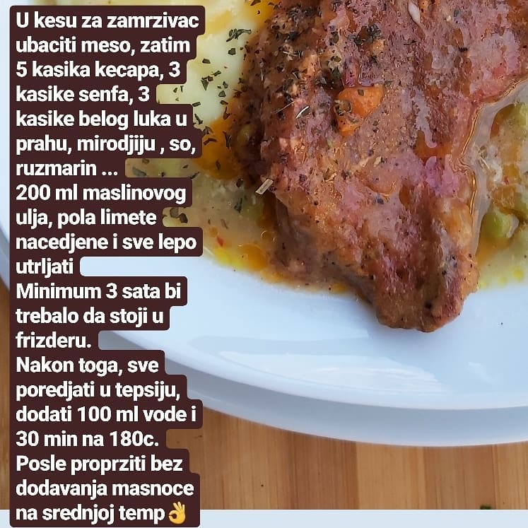 Pre svega bitno je odabrati dobar komad mesa, zatim je bitno da se marinada prilagodi tako da se najprostije rečeno ne ubije ni jedan ukus i da se oseti ,, slast ,, . Meso mariniram uvek u kesama za pečenje, velike su, praktične i više ih koristim za mariniranje nego sa pečenje😂..