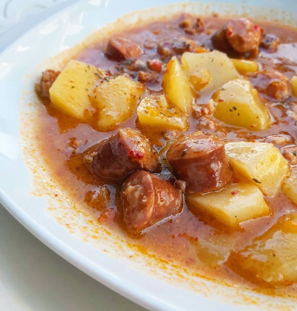 4 srednja krompira, 2 veća crna luka, 150 gr mesanog mlevenog mesa, 3 kobasice( po želji, svakako se termički obradjuju)
