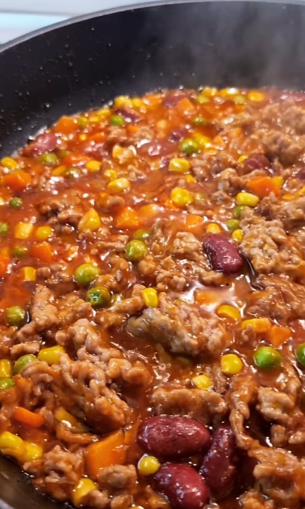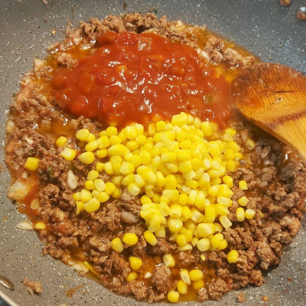 Zatim dodati paradajz( iseckan u secku) ili sok od paradajza ,mleveno meso i začine. 🍅