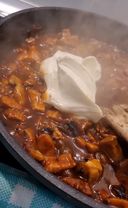 Dodati kašičicu belog luka u prahu, kašičicu kurkume i kasicu soli. Kada se piletina lepo obradi, 500 gr pečurki na listove dodati i umešati sa piletinom.