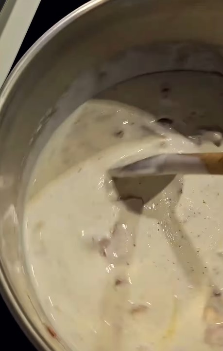 Nalijete zatim 400 ml mleka, dodajete @yumis.rs pileću krem supu , i 3 kašike kajmaka.