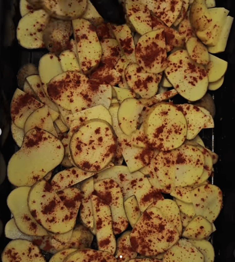 Iseckajte tanko par krompirića kao za čips, u nauljenoj tepsiji poređajte.